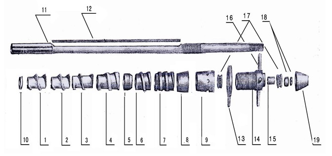 (2)榨螺的安裝:將榨螺立起細(xì)端向上,裝上檔圈,在把榨螺由1號起依次裝于軸上,然后用鎖緊螺母壓緊,以防油渣深入榨螺孔內(nèi),影響榨螺的拆卸。(調(diào)節(jié)螺母使調(diào)節(jié)栓兩端是8309軸承,裝時兩軸承大孔面均靠在調(diào)節(jié)螺栓的兩端面。榨螺整體裝齊后用兩個(M42×2)的螺帽背緊,背緊時注意兩個8309軸承的縫隙 。用手搬轉(zhuǎn)調(diào)節(jié)螺栓,感到轉(zhuǎn)動靈活時即可。
