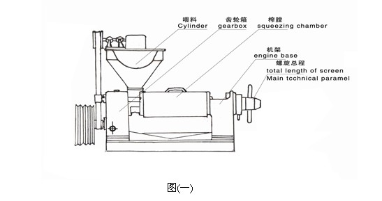 2.結(jié)構(gòu):該機(jī)有進(jìn)料斗部分,齒輪箱部分,榨膛部分,榨螺部分,機(jī)架部分共五大部分組成:見圖(一)